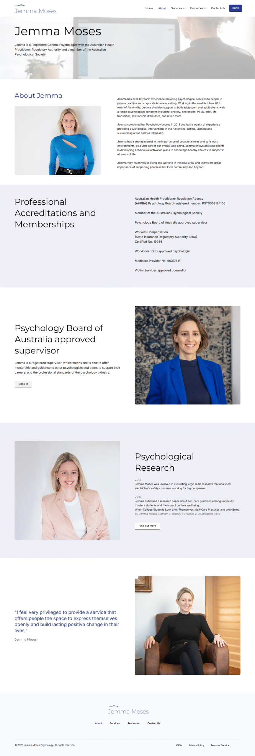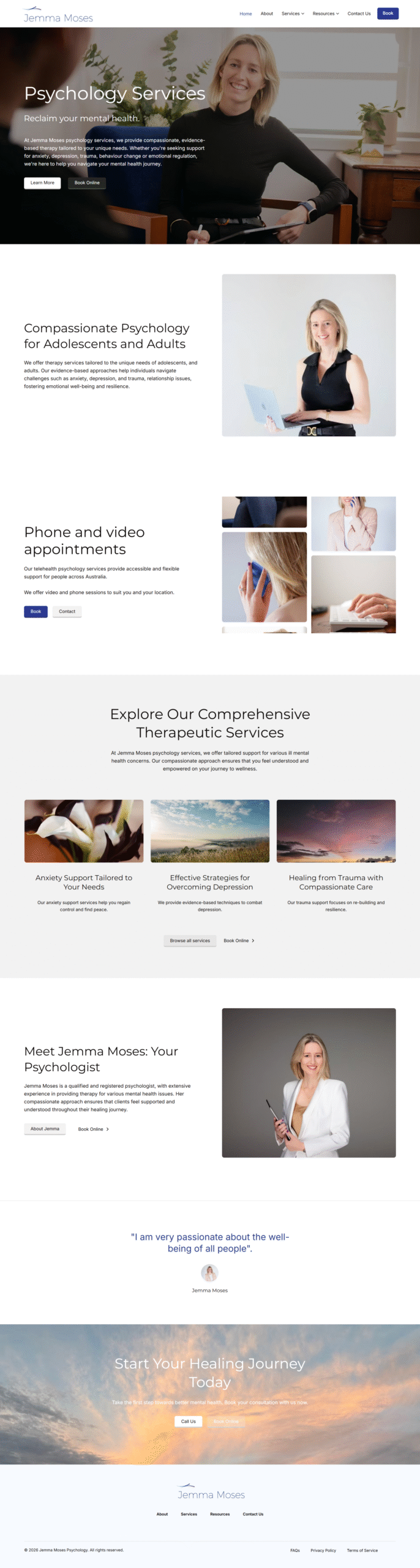 Jemma Moses Psychology required a calm, trustworthy, and professionally structured website that reflects empathy, credibility, and emotional connection. The goal was to create a digital presence that feels welcoming and safe while clearly presenting psychological services and encouraging client inquiries.