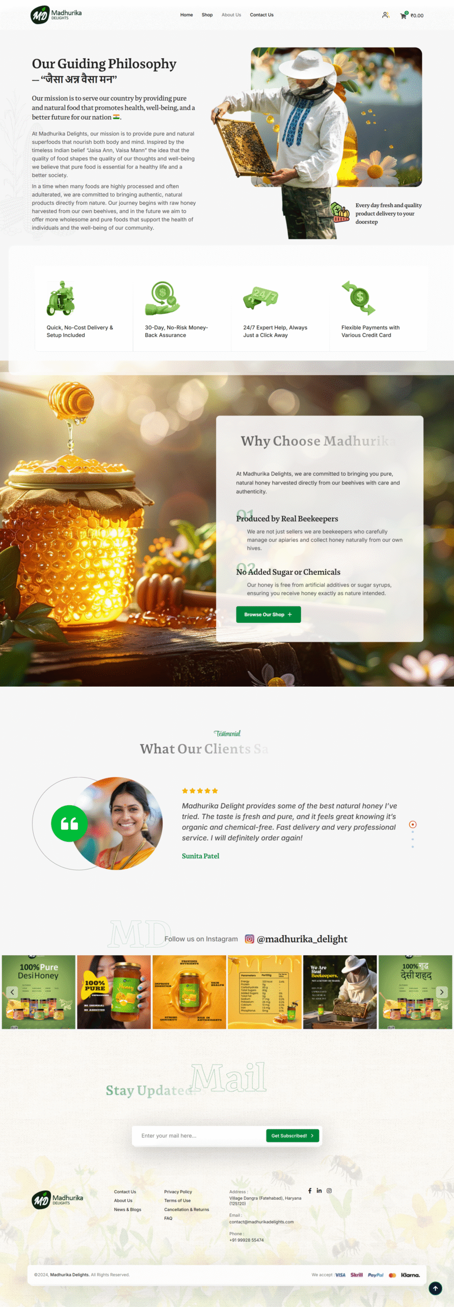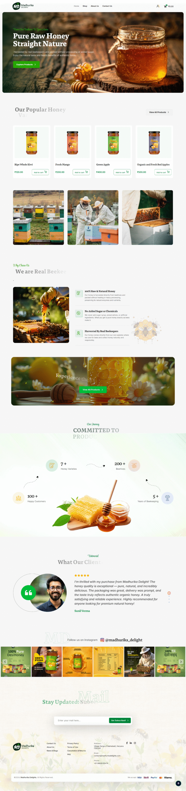 The website was developed with a clean and nature-inspired design approach, using warm tones, balanced layouts, and high-quality visuals to reflect the authenticity of honey products.
