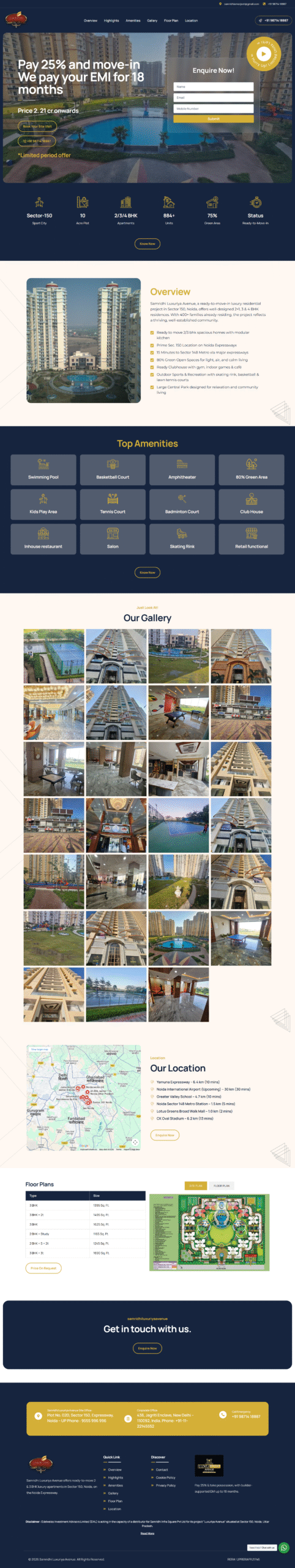 The landing page was structured with elegant typography, spacious layouts, and high-quality imagery to reflect the premium identity of Samridhi Luxuriya. Strategic section placement ensured a natural storytelling flow from introduction to amenities to inquiry.